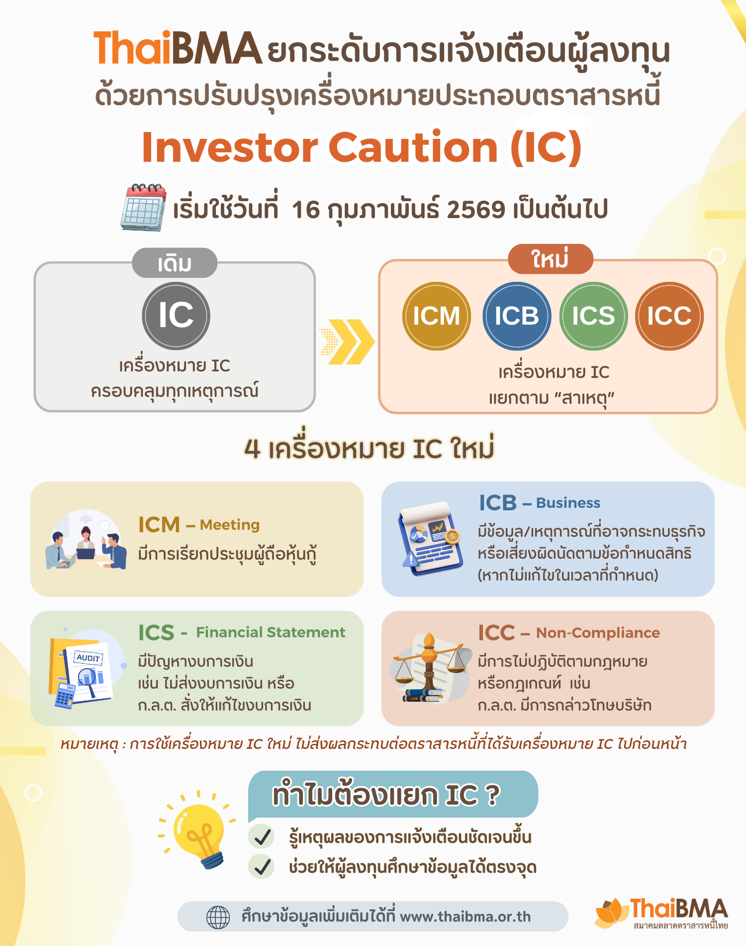เพื่อให้การแจ้งเตือนผู้ลงทุนมีความชัดเจนและสะท้อนเหตุของการแจ้งเตือนได้อย่างเหมาะสม ThaiBMA จึงได้ปรับปรุงเครื่องหมาย IC โดยแยกเครื่องหมายตามเหตุของการแจ้งเตือน ออกเป็น 4 เครื่องหมาย ดังนี้